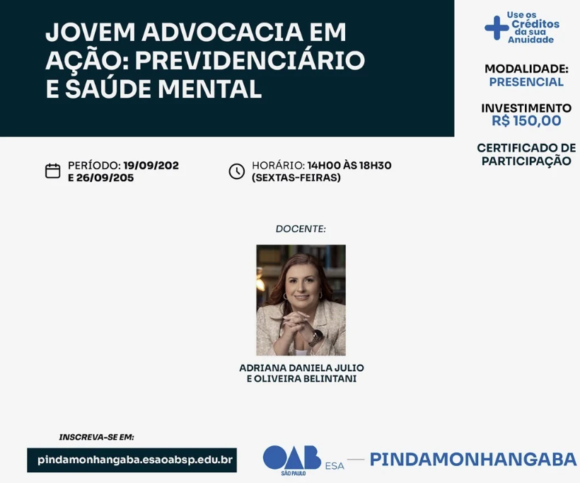 “Jovem Advocacia em Ação: Previdenciário e Saúde Mental” encerram em 17 de Setembro.